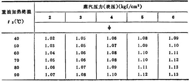 (2)油罐内的重油加热器计算:当加热重油所需的热量Q为已知时,其加热面积可按下式计算: F=1.25QΦ/KQ(tb-ty)(m2) (8) 式中:F——加热器面积,m2; Q——加热重油所需总热量,kcal/h; Φ——蒸汽凝结水的过冷却系数,取决于重油的加热终温t2,由表14-2-72查得; 表14-2-72 蒸汽冷凝水的过冷系数Φ值