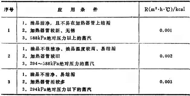 R——影响传热效果的补充热阻m2·h·℃/kcal,可由表14-2-73选取,一般取R=0.002; 表14-2-73