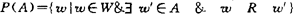 | 释义 | 量词模态逻辑的代数语义学 模态逻辑是研究“必然”与“可能”等模态概念的逻辑学说。 模态逻辑有著悠久的历史。亚里士多德在创建形式逻辑时就用了比实然逻辑多两倍的篇幅来讨论模态逻辑,但后来被忽视了。20世纪初刘易斯(C.I.Lewis)为了摆脱实质蕴涵悖论而引进模态概念,从而定义了严格蕴涵以代替实质蕴涵。并于1932年与兰福德(C.M.Langford)合著《符号逻辑》一书,提出了S1-,S5等5个著名模态命题逻辑系统,才使模态逻辑得以复兴。 60年代以前,模态逻辑的研究主要限于命题模态逻辑;极少论及量词模态逻辑的工作,而且成果也甚少。 40年代麦克铿赛(J.C.C.McKinsey)和塔尔斯基(A.Tarski)对刘易斯的系统S2与S4引进了代数语义。 假设S为一个非古典命题逻辑系统。以由叠合S中之等价公式而得的S的Lindenbaum-Tarski代数( 作为格来说为完备的5代数称为S*代数。 显然,如果系统S的任一公式φ当看作任一S代数A上的多项式Φφ时恒取A的幺元(即最大元)V为值,则φ必定是S的定理,即 1959年克瑞普克(Saul A.Kripke)发表了题为“模态逻辑中的一个完全性定理”的论文。此文的重大意义在于首次对一阶模态系统提出可能世界(possible worlds)语义(亦称关系语义)并对基于刘易斯系统S5之上的量词理论S5*证明了相对于此种语义的完全性定理。 早在1953年拉西阿娃(H.Rascowa)等便用代数方法研究了S4(即Sλ)的量词理论S4*的代数语义完全性问题。同时被研究的非古典逻辑尚有正演算Sπ、海丁(A.Heyting)直觉主义演算Sx和约翰逊(J.Johanson)的极小演算Sμ等,相应代数分别为相对假补格、海丁代数(亦称假布尔代数)以及约翰逊代数。 拉西阿娃等对基于一般命题逻辑S之上的谓词逻辑S*所提出的代数语义可溯源于1948年莫斯托夫斯基(A.Mostowski)关于某语句σ在海丁谓词演算 在这种解释下莫氏证明 1953年拉西阿娃等证明了上述诸系统(包括Sλ即S4)皆有性质(E),从而对它们得到了哥德尔型完全性定理。1963年高恒珊运用哈尔姆斯关于一目布尔代数的表示定理证明了S5(即Se)具有比(E)稍弱的性质(σE),从而对量词理论S5*证明了哥德尔型完全性定理。1964年他又进一步证明上面的代数A可取为域为 继1959年的工作之后,克瑞普克又于1963年对正规模态命题演算S=T,S4,B,S5提出了语义分析。考虑如下公理模式和推理规则:A0.全部重言式,