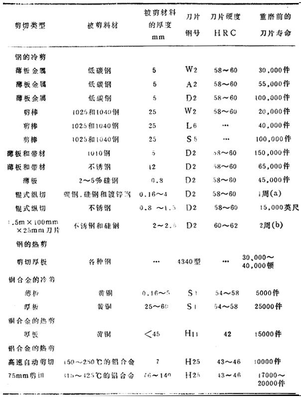 | 释义 | 金属的热剪切 当剪切较厚和抗剪切的材料时,或者作为加工过程的一部分另有所需时,要用热剪切工艺。H型二次硬化工具钢在425℃下作热剪刀片时,具有满意的抗软化能力。 H11工具钢对大多数热剪都是满意的,稍贵的H12和H13钢也被推荐应用,没有任何数据可以证明这三种钢中的任一种要比其余两种好些,只有当H11经过试用而不能适应要求时,才用更贵的H21和H25钢。然而,在许多例子里,应用高合金工具钢制作热剪刀。例如,个大工厂,用H25作为在150~425℃下热剪铝的标准刀片材料。剪刀片的使用数据如表35所示。 表35 剪刀片的使用数据