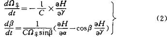 这里,C为金星的极主惯性矩,Ω♀为其自转角速率,U1为固体潮势,U2为大气潮势,U3为地球对金星赤道永久形变部分的引力势,U4代表核幔粘滞性耦合作用。 其中U2的计算涉及金星大气密度的潮汐振荡,为了估算出由U2产生的大气潮扭矩,就必须对金星大气的状态进行实测,并建立适用于金星大气热潮汐的模型。因此,如何计算大气潮扭矩就成了建立金星自转演化理论模型过程中的主要难点。 自20世纪60年代以来,前苏联和美国对金星共发射了30个空间探测器,获得了大量有关金星大气基本状态的实测资料,可用来建立温度场、压力场、和密度场在金星大气层中的分布。利用数值方法对决定大气潮的流体动力学方程组求解后,可得到金星大气潮中各主要潮波(半日潮和全日潮等)的振幅,然后按全球积分就能求出对金星自转演化有贡献的长期项分量。 金星自转角速率Ω♀和轨赤交角β的变率与哈密顿函数H的关系可表示为: