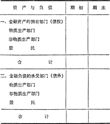 用来反映在一定时点上,国家对内对外资产负债情况的报表。 可作为国内经济和对外经济决策的依据。在时间上分为期初、期末分项核算,以反映资产负债动态变化的结果即增加或减少。对外金融资产与负债按余额汇集总额。 资产余额包括国际储蓄(有外汇储备,特别提款权,在国际货币基金组织的储备头寸)、对外资产余额(有对外贷款、对外投资、延期收款、预付款、地方部门企业境外存款及其他)。 负债余额包括对外负债余额(有国外借款、证券发行、延期付款、预收款,使用国外短期资金及其他)。外商在华投资余额,资产余额与负债余额比较,资产大于负债为对外净资产,相反则为净负债。 对内金融资产与负债是以国民经济为主体核算的金融债权债务,并按部门和形式分别核算比较国内金融资产与负债按部门划分如下: 国内金融资产负债表(按部门划分)  部门内及国民经济整体的资产大于负债为拥有净产权,相反为净负债。与国外金融资产与负债相联系,可以反映国民经济的金融债权债务整体状况。按资产与负债的形式划分,国内金融资产的形式有现金、活期存款、定期存款、信托存款、短期债券、长期债券、股票、应收预付款、其他等项目;国内金融负债的形式有短期贷款、中长期贷款、股票、应付预收款、其他等项。本表由国家统计局、中国人民银行和外汇管理局共同研究布置各部门填制。 |