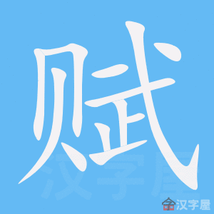 字源解说 武,既是声旁也是形旁,表示战备、兵役。赋,金文 = (武,兵役)+ (贝,钱财),造字本义:代替兵役的税款。有的金文 调整结构。篆文 承续金文字形 。 附 文言版《説文解字》:賦,斂也。从貝武聲。 附 白话版《说文解字》:赋,征收钱财。字形采用“贝”作边旁,“武”作声旁。 引申线索