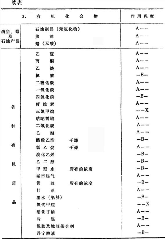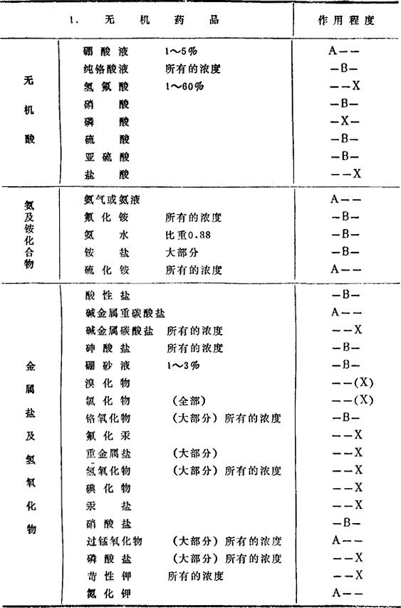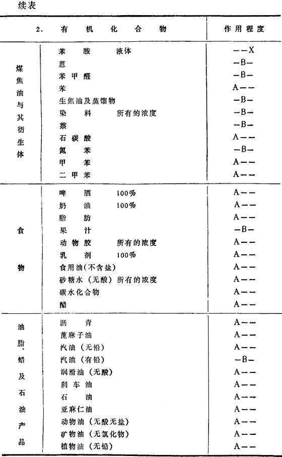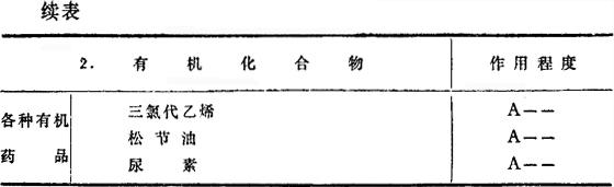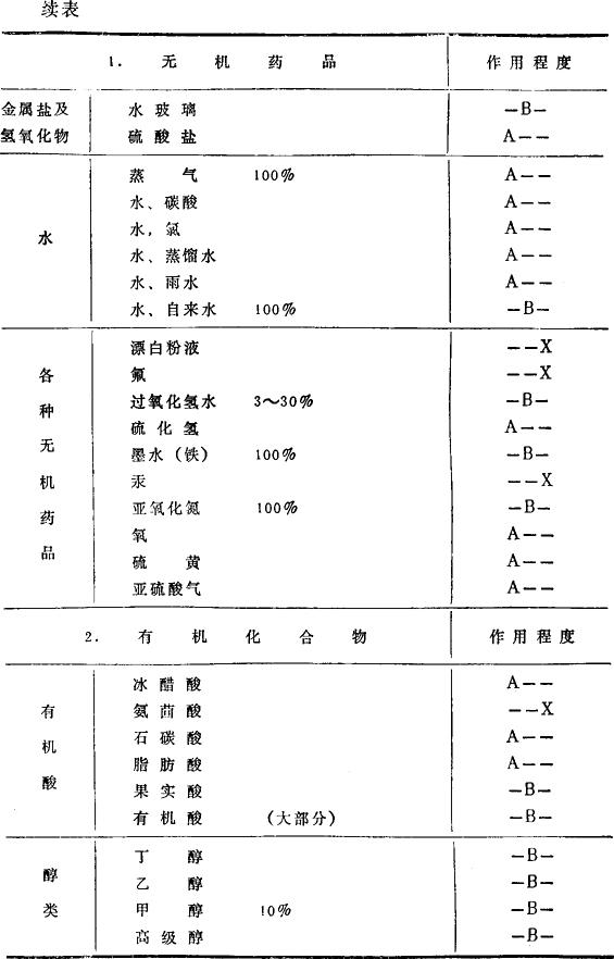 注:A:除铝中含有对该药品有腐蚀性的不纯物,或接触异种金属的电解腐蚀等复杂情况外,一般在常温下对药品都没有大的浸蚀。