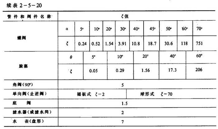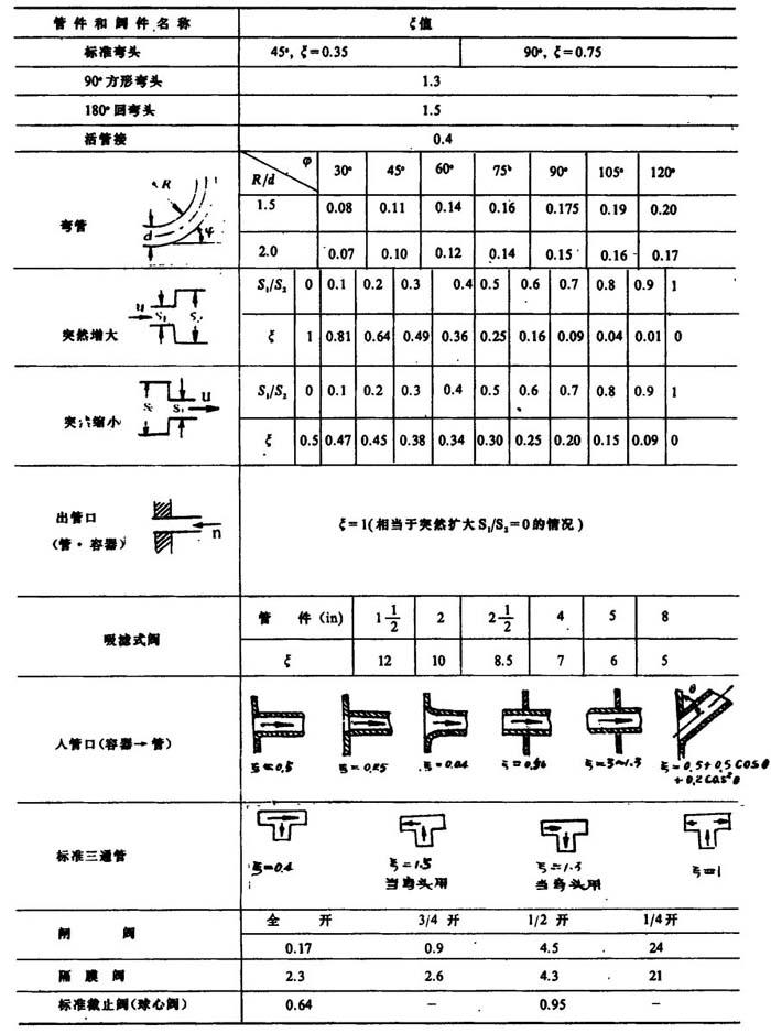 | 释义 | 阻力系数法 [说明]流体流动时克服局部阻力所引起的能量损失,可以表示为介质流速u2的倍数,这就是阻力系数法。局部阻力系数ξ主要表示局部障碍的几何形状对局部阻力的影响,其值根据局部区域的具体结构,由实验测得,表2-5-20列出了管件和阀件的局部阻力系数,供参考。应说明的是,表中所给的值只是约略值,并不十分精确,以弯头来说,煨制弯头、冲压弯头和焊接弯头的局部阻力系数是不同的;在各种三通中,因管径组合不同,其局部阻力系数也不一样。 表2-5-20 各种管件和阀门的局部阻力系数ξ值