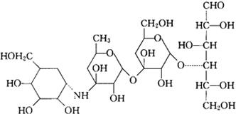 C25H43NO18=645.61 CAS-56180-94-0 O-4,6-D-脱氧-4-[[(1S,4R,5S,6S)-4,5,6-三羟基-3-(羟甲基)-2-环己烯-1基]氨基]-α-D-吡喃葡糖基-(1→4)-D-α-D-吡喃葡糖基-(1→4)-D-葡萄糖。 O-4,6-o-oeoxy-4-[[(1S,4R,5S,6S)-4,5,6-trihydroxy-3-(hydroxymethy1)-2-cyclohexen-1-yl]amino]-α-D-glucopyranosyl-(1→4)-O-α-D-glucopyranosyl-(1→4)-D-glucose. 降血糖药。 Acarbose,Glucobay,Bay-g-5421,GHI. INN,USAN,MI.  |