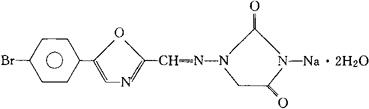 | 释义 | 阿珠莫林钠 C13H8BrN4NaO3·2H2O=407.16 CAS-91524-18-4 CAS-64748-79-4 1-[[[(5-(4-溴苯基)-2-噁唑基]亚甲基]氨基]-2,4-咪唑啉二酮钠盐,二水合物。 2,4-Imidazolidinedione,1-[[[(5-(4-bromophenyl)-2-oxazolyl]methylene]amino];sodium salt,dihydrate. 1-[[[5-(对-溴苯基)-2-噁唑基]亚甲基]氨基]乙内酰脲,钠盐,二水合物。 1-[[[5-(p-Bromophenyl)-2-oxazolyl]methylene]amino]hydantoin,sodium salt,dihydrate. 骨胳肌松弛药。 Azumolene Sodium,EU-4093. INN,USAN.