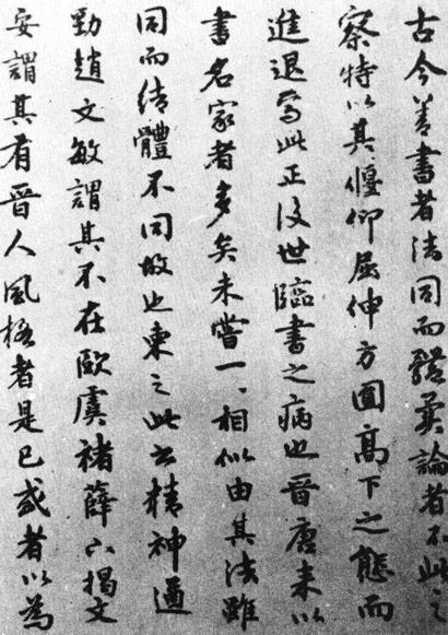 【赏析】: 董琰书法追求敦厚凝重的笔触和气质。从这件作品来看,字裏行间流溢著端方朴茂的收敛与涵容,颇有晋唐书风中的平实精神。 俗语说“大巧若拙”,董氏在平实的用笔和结体布白当中,以拙来改造元明时尙,很有“无色无相”、“纳须弥于芥子”的意味。例如,点画不取尽势尽情的舒展放纵,而是点到辄止,体现了一种“意到”亦即“形神均到”的虚无与实在。所以,初观平淡,再品则味出,反复把玩则意韵无穷。书法艺术的种种美感不惟表现作者和与作者相关的一切,也能爲观者进行审美活动提供联想方向,并给以“言有尽而意无穷”的回旋余地。董氏的这件作品似乎初步做到了这一点。 |