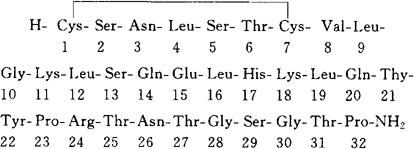 | 释义 | 降钙素[中] C145H240N44O48S2=3431.88 CAS-47931-85-1 降低哺乳动物血浆中的的钙浓度的多肽激素或从合成获得的同样物质。 A polypeptide hormone that lowers the calcium concentration in the plasma of mammals,or the same substance obtained by synthesis. 降(血)钙素。 Calcitonin(source). 甲状腺降(血)钙素。 Thyrocalcitonin(source),Calcimar,Cibacalcin. 钙代谢调节药。用于佩吉特瓦病。 INN,BAN,USAN.
