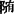 suí 11画 阝部 左右 会意字 BDEP 【笔顺】 随 【释义】 ❶ (动)跟著:我~你一起去。 ❷ (动)任凭:~便|~意。 ❸ (动)顺从:~和。 ❹ (副)顺便:~手关门。 ❺ (动)〈方〉像:她长得~她爷爷。 ❻ (介)引进动作行为所依赖的条件:~机应变。 【随从】suícóng ❶ (动)跟随(首长)。 ❷ (名)随从的人员。 [近义]跟从 跟随 相随 [例句]他自五岁开始,就一直随从父母走南闯北,过著漂泊不定的生活。/市长带了两名随从。 【随和】suí·he(形)和气;不固执。 [近义]和顺 [反义]孤僻 乖僻 [例句]他人很随和,与任何人都能友好地相处。 【随口】suíkǒu(副)不加考虑地顺口(说出)。 [例句]小明的记忆力非常好,唐诗、宋词他随口就能来两句。 【随意】suíyì(动)随著自己的心意。 [例句]这是道开放性试题,你可以随意作答,只要言之成理即可。 【随遇而安】suí yù ér ān(成)不论什么情况都能适应,在任何环境中都能满足。 [例句]无论处于什么境况,他都能随遇而安,真让人佩服。 组词:随风 随机 随即 伴随 尾随 相髓 追随 随风转舵 随行就市 随声附和 随心所欲 言出法随 |