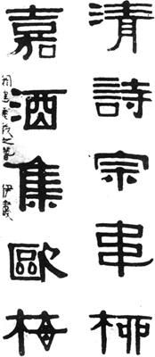 | 释义 | 隶书联 【作品赏析】: 这幅楹联是伊秉绶在嘉庆十九年所书,代表了他的书法成熟阶段的风格。 在用笔上,笔势稳健,笔画平直,圆曲较少,粗细相差不大。在结体上,四边充实,字形方正。在布白上,字的分布均匀,外围余地很少,显得严肃庄重而又大方。 较大的字,雄伟壮观,使人心胸广阔。 “欧”字下面两个“口”和“梅”字右侧两点约呈圆形,使得方中有圆。“清”字的三点水偏上,“青”字上紧下松,使得实中有虚。“韦”的最后横笔和每个字的波、磔多呈弧形,使得直中有曲。“宗”、“集”二字的两点,短而外撇,使得长中有短。 “诗”字左右两部分占据的空间一反常态,使得常中有变。行书小字落款,与庄肃的隶书大字相衬托,使得大中有小。综观此作,静中有动,严整而不板滞,凝重而有韵致,古朴肃雅,格调甚高。从作品的继承关系看,没有一般隶书的“蚕头燕尾”,而是笔画简练,不作粉饰,显得朴实雅观。 作品似有《戚伯著》、《校官碑》、《三公山》的某些笔意,也似有《衡方》、《郙阁》、《张迁》、《礼器》等碑笔力雄强、挺拔浑厚的长处,很难把他的隶书归于汉隶的哪一类,同时又无不具有各类的优点。所以说,伊秉绶在隶书的创作上是自成一格,开了隶书的一派。 他的晚期作品写得比较随意,但仍不失法度,更显得变化莫测,简淡自然,这是他书法艺术造诣极高、纯熟完美的时期。伊秉绶的隶书,在清代书坛上大放异彩,与邓石如并称大家。蒋宝龄在《墨林今话》中说:秉绶“尤以篆、隶名当代,劲秀古媚,独创一家。”何绍基在《东洲草诗抄》中说:“文人八分出二篆,使墨如漆楮如简。行草亦无唐后法,悬厓溜雨驰荒藓。不将俗书薄文清,觑破天真观道眼”。 。【作者介绍】:伊秉绶(1754-1815),字组似,一字墨卿,晚号默庵。 福建汀州宁化县人,故称“伊汀州”。乾隆五十四年进士,曾知惠州、扬州等府,有政声。擅长书画、篆刻、诗文,以隶书成就最高,影响最大。著有《留春草堂》。 。