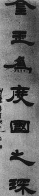 他的隷书虽得力于《曹全》,但就整体而言,此联比《曹全》紧密而又开张,厚重而又雄健,实有许多创新处。联中的字,凡有波、磔笔画者,大胆突出磔笔,写得壮而且长,如“天”、“金”、“度”、“琛”等字。他善于处理笔画间的呼应关係,或以小应大,如“爲”字的折笔与波笔;或以大应小,如“天”字的磔笔与波笔;或以弱应强,如“其”、“玉”中的两点和“爲”的四点与各自的主体部位。使用反衬手法,往往能收到意想不到的艺术效果和表现出异乎寻常的审美情趣。姚元之的这幅隷书对联成功地体现了这点。 |