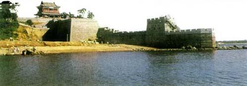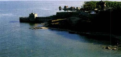 老龙头 老龙头位于山海关城南5公里处的临海高地上,这里是万里长城的东部起点。万里长城好似一条翻山越岭的巨龙,从西边蜿蜒而至,将头伸进渤海里吞波吐浪,因此,人们形象地称之为老龙头。这里依山面海,优越的地理位置,加上精心构筑的军事防御工程,使老龙头成为一座名副其实的海陆军事要塞。老龙头原有海石城、靖卤台、澄海楼,海神庙等建筑,1900年毁于八国联军战火。如今经过多次修复这里已基本恢复原貌,主要景点有入海石城、靖卤台澄海楼、宁海城、海神庙等。入海石城是老龙头长城伸入渤海的首端,整座建筑威然屹立在海面上,好像一艘时刻准备乘风破浪的航船。靖卤台是老龙头长城的桥头堡,是一座屹立于海上的天然屏障。澄海楼是老龙头的制高点,登临其上放眼四望,观海览胜,但见云海渺茫,海天一色,山高路远,长城蜿蜒。面对碧海波涛汹涌起伏,万里长城龙游蛇舞,你心中一定会荡起豪情万丈。