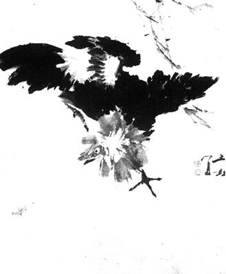 | 释义 | 雄鸡捕虫图 【作品赏析】: 萧朗的花鸟画多属于小写意,其艺术语言洗练朴实,风格秀润清新,形象简括自然,画面幽雅生动。 每一笔都蕴合著丰富的色泽,却又洁净明快。画家认为花鸟画的核心问题在于灵境的创构,主张在作品中充分表达自己触景而生的情趣和意象,强调透过鸿蒙之理,将静穆的观照与活跃的生命统摄到生动的艺术形象之中。为了增强生活气息与艺术情趣,他有时画入一些情节,喜欢对形象进行适度夸张。此图便是一个例子。 画中的雄鸡鼓翅奋翼,直逼草虫,在疾飞猛进中突然掉头张喙,其动态之大,神意之奇,为历代画鸡者所难能。且喜夸而不诬,饰而有节,颇能符合人们的审美胃口,向为观者所赞服。 而那只行将丧生的草虫则振翅飞窜,仓皇逃命,使画面构成一种特定的飞扬舞动的情势。几笔飘摇无定的草叶则为这种情势助长了音乐般的波澜,形成了艺术的韵味和旋律。 在形象表现上,画家强调“见笔”,突出了一个“写”字。 他行笔稳健沉著,多用侧锋,杂以中锋、拖笔或戳点,力求将全身气力通过运腕注入笔端。所画鸡爪虫足,一笔不苟,笔笔到家,直入书家三昧。 。【作者介绍】: 萧朗,原名印钵,别署萍香阁主人。 名其室曰“豆斋”。1917年生于北京。早在三十年代,即成为画家王雪涛的入室高足,同时受过齐白石、王梦白、陈半丁等人的指点和教益。从四十年代起先后在北京师范大学、河北艺术师范学院、广西艺术学院任教。现为天津美术学院中国画教授。以花鸟画知名于世,尤以画鸡和各种草虫为人们所称道。有《萧朗课徒画稿》、《怎样画写意草虫》、《花鸟画技法问答》(合撰)等著述。 。
