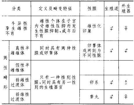 ❹ 行为的。家畜中雌雄间性主要有:❶ 异性孪生雌性不育;❷ 真性半雌雄体和假性半雌雄体;❸ 偏向一种性别的弱过渡体。详见下表。