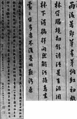 【简介】: 近代·王树枏书于1932年。纸本。行书四行,古体诗一首。《当代名人书林》著录。 【赏析】: 北碑书法,最终存世之面目,多是刀刻后的效果,形成其独特的“碑派”审美徵象;而原来由笔纸书写或书丹之妙隐然不可追索,即使是刻工精细者,也难以绝对地保持固有的笔墨质感。这是审美特徵的工具性蜕变,同时也给后人的艺术实践带来一个疑难。人们在临习的时候,往往忽视碑书的本质,斤斤计较于旣刻之字的点线肖像,以致于大大扭曲了“书写”的自然意义而流于刻作,能透视刀刻表象深入书法之理,融书、刻于一致者实实不易。 王树枏的这件作品略有起色,其用笔简、直而凝重,经过匠心排布而不失自然性情,深得六朝碑刻的资质;其浅看能圆、深味能方、不伸不拓的点划,和全在方体上紧装严束的字态,与其说它神似六朝,毋宁说是它对北碑书法客观审美特徵在“书写”意义上的中和反应和提摄,因而更流露出北碑系所没有的文人化—书卷气—碑刻书写韵味。 没有入木三分的眼力以及灵敏度极高的手感,是很难把握这种刀、笔之间的度数的。