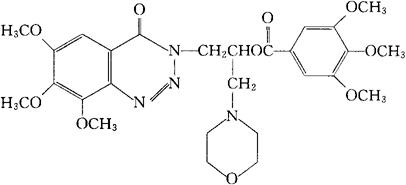 C27H34N4O10=574.59 CAS-30271-85-3 3,4,5-三甲氧苯甲酸1-(4-吗啉甲基)-2-(6,7,8-三甲氧-4-氧代-1,2,3-苯并三嗪-3(4H)-基)乙酯。 1-(4-Morpholinylmethyl)-2-(6,7,8-trimethoxy-4-oxo-1,2,3-benzotriazin-3(4H)-yl)ethyl3,4,5-trimethoxybenzoate. 3,4,5-三甲氧基苯甲酸与3-(2-羟-3-吗啉代丙基)-6,7,8-三甲氧-1,2,3-苯并三嗪-4(3H)-酮的酯。 3,4,5-Trimethoxybenzoic acid ester with 3-(2-hydroxy-3-morpholinopropyl)-6,7,8-trimethoxy-1,2,3-benzotriazin-4(3H)-one. 冠脉扩张药,抗心绞痛病药。 Razinodil,CAS 7709. INN,USAN.  |