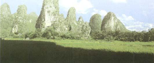 沿桂荔路南行,只见青山翠崖,峰回路转,稻田层层,村舍星布。绿色的金宝河和玉龙河在合山江口汇合成田家河,流向漓江。过去在合山江口曾有一渡,河水清碧,缓缓东流,两岸绿竹旖旎,凤尾婆娑,这就是“青古渡”。还可见田家河上游有一山,极像涉水过江的骆驼,人称“骆驼过江”。