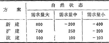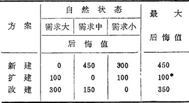 1.最大最大收益值法(大中取大法或乐观法) 即选用最大收益中最大的一个方案。表6-4中三方案最大收益分别为800、700、500。其中,新建收益800为最大,故可选用“新建”方案。 2.最大最小收益值法(小中取大法或悲观法) 即选用最小收益中最大的一个方案。表6-4中三方案的最小收益分别为-400、-200、-100。其中改建又是三者中最大的(-100),故可选用“改建”方案。 3.最小最大后悔值法(大中求小法则) 即选择最大后悔值中最小的那个方案。所谓“后悔值”,是指各自然状态下最大收益与最小收益之差。可理解为:如果实际出现最大收益的情况,而决策者将因为未选择相应方案,后悔少获得那部分应得的收益。由表6-4相应计算后悔值而得表6-5。因三个方案的最大后悔值中,以扩建方案的最小,故选用“扩建”方案。 表6-5 后梅值表